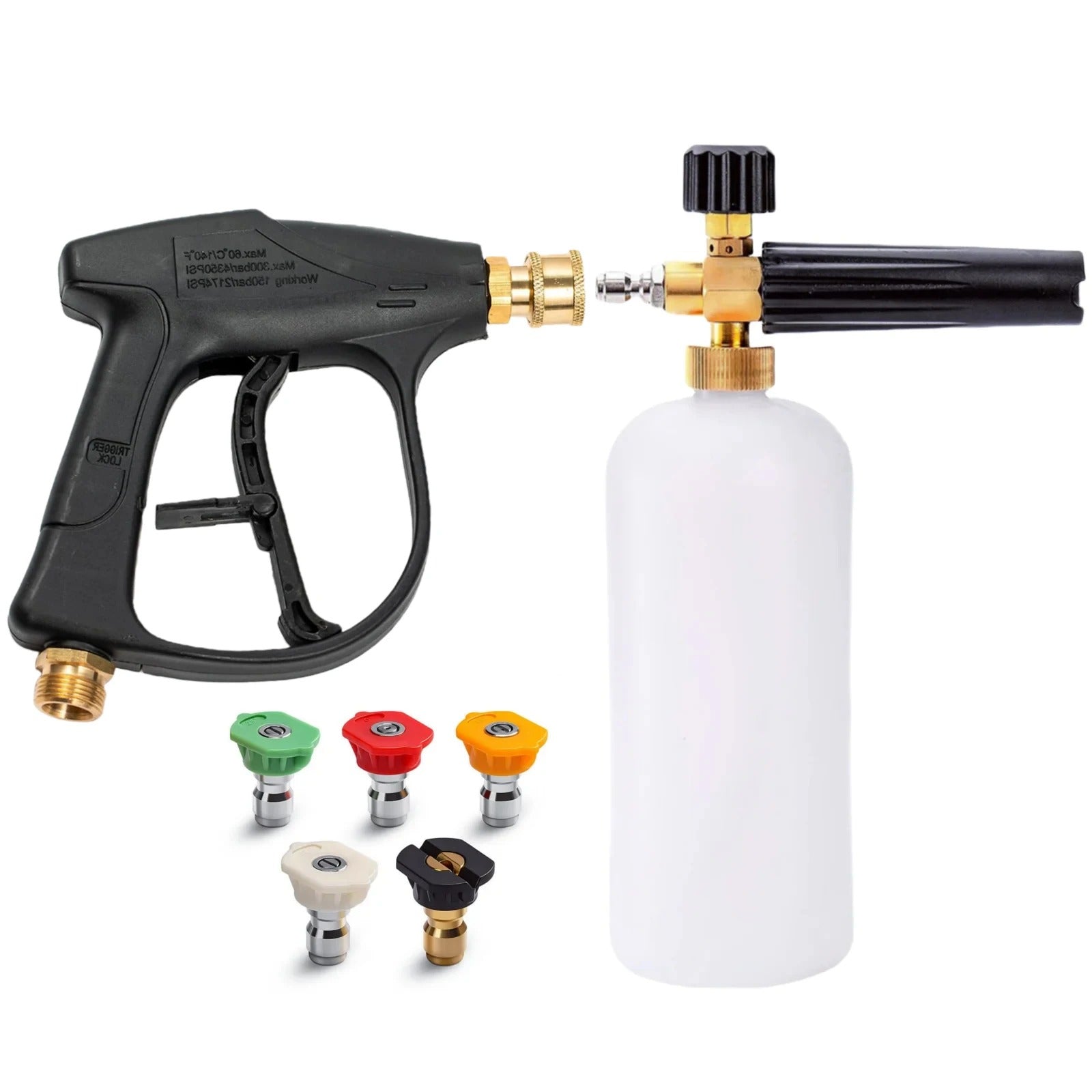 Rüsten Sie Ihre Ausrüstung für die Außenreinigung mit diesem Hochdruckreiniger-Spritzpistolen-Set auf, inklusive Schaumflasche und verschiedenen Düsen. Es eignet sich ideal zum flexiblen Waschen und Spülen von Autos, Terrassen, Einfahrten, Gartengeräten und anderen Oberflächen im Außenbereich.